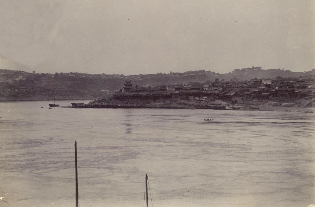 这是一张视野宏阔的晚清重庆全景照片,图中渝中半岛自鹅岭浮图关延伸而来,重庆古城垣像腰带一样镶嵌在半岛周缘,城内密布白墙黛瓦,依稀可见各大型会馆建筑。左侧长江中的珊瑚坝清晰可见。作者为了拍摄山环水绕的重庆古城,煞费苦心,一直在南山上才寻找到最佳拍摄点。