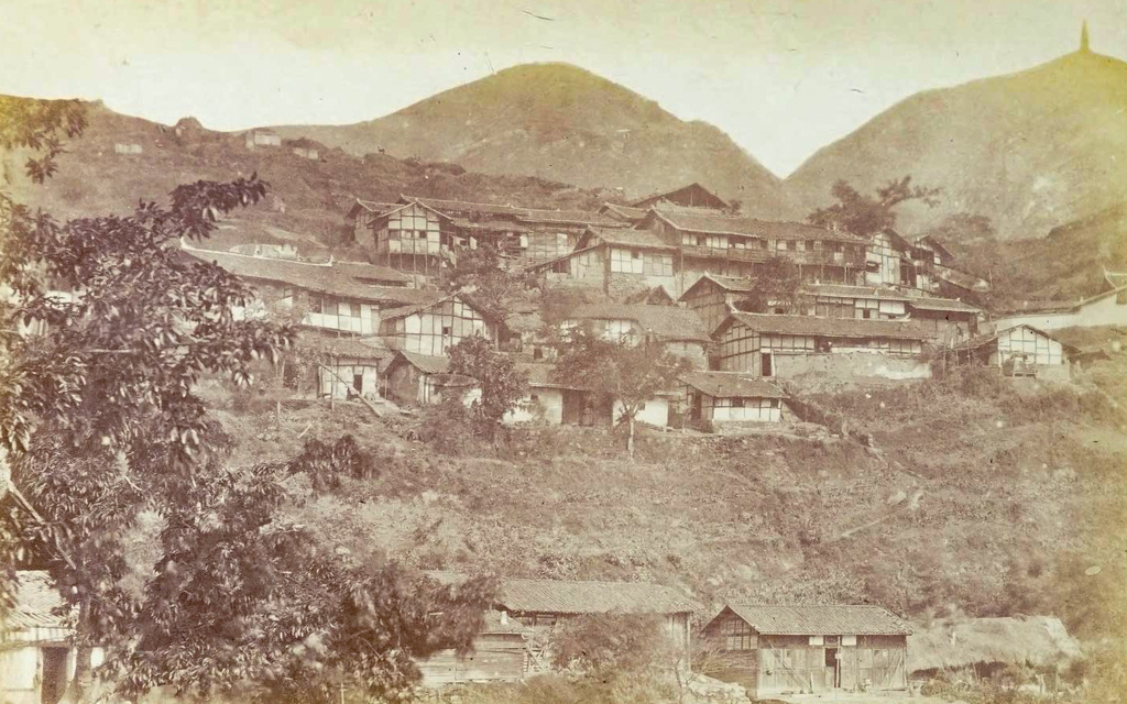 该图为重庆古城长江南岸的海棠溪一带,是重庆城通往贵州的渝黔古道起点,远处为南山。 图中的建筑多为民居,一排排房屋依山渐次升高,样式为传统的穿斗式建筑